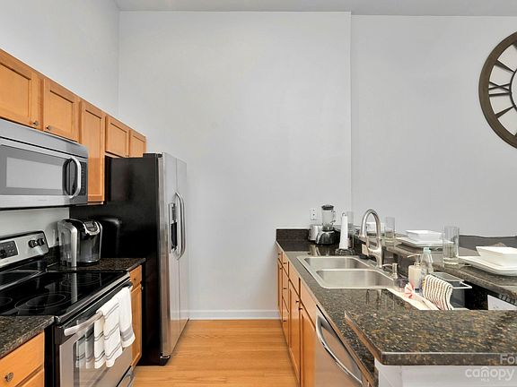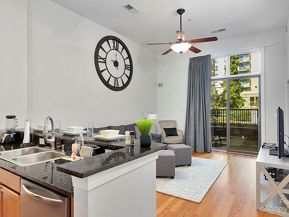Wow! Don't miss this urban paradise with amazing pool and courtyard views. This ground floor gem offers tall ceilings, a spacious kitchen with modern appliances, in-unit laundry, and a large living room. The bedroom boasts beautiful courtyard views, while the bathroom features a tub and shower. Enjoy the oversized balcony. Community amenities include an outdoor pool, barbecue areas, fireplace, and a rooftop terrace. Assigned parking spot. Prime location in the heart of Charlotte, close to public transportation, bars, restaurants, and city life. Don't miss this tranquil oasis! AirBnb / short term rentals are allowed as a one week minimum.