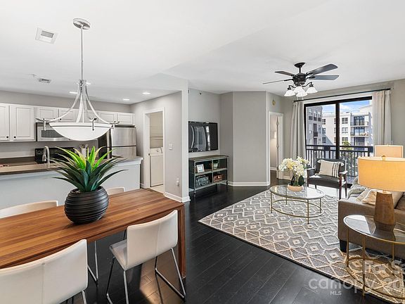 6th Floor unit with courtyard & pool view from private terrace! Features include stainless steel appliances, farm house sink, hardwoods throughout, marble vanity countertop, tile flooring & surround shower. This unit is boasting with natural light & neutral paint. Community conference/clubroom on 8th floor w/ tv, fire pit, gas grill and of course, Charlotte skyline views! Perfect for entertaining! Location is very ideal & extremely walkable. Restaurants, nightlife, Panthers Stadium and the Trolly right outside the building front door. LAZ offers additional parking spots for lease in the parking deck. Gas line behind electric stove. BRAND NEW HVAC April 2024!!