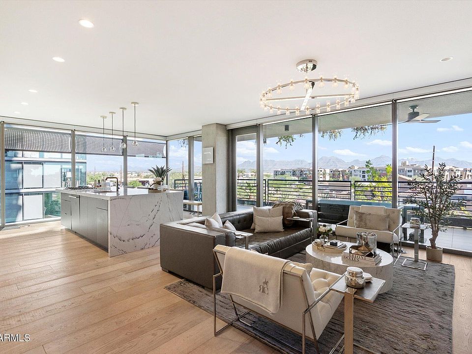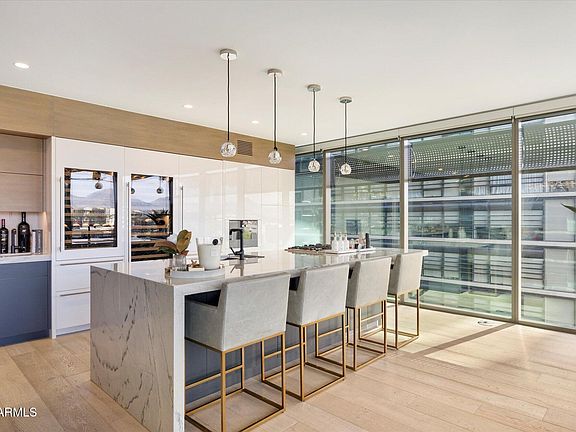 Experience elevated living in this sophisticated turn-key residence at Optima Kierland in the Scottsdale Quarter. This designer-styled 2-bedroom, 2-bath end unit exudes modern luxury, featuring a 72'' floating gas fireplace and custom entertainers wet bar with icemaker and champagne sink. The chef's kitchen dazzles with a quartzite Calacatta island, Sub-Zero refrigeration and bottom freezer, dual subzero wine coolers, Gaggenau oven/microwave and a discreet Wolf hood seamless intergrated.. The primary suite offers a serene retreat with custom California Closets, dual vanities, spa shower, and dedicated home office with custom cabinetry. Wide-plank wood floors, motorized shades t/o, and mountain-views and covered balcony, complete this architecturally elegant home. This unit comes with 2 garage parking spots in the coveted L1 garage. One of the spots has a dedicated EV charger.