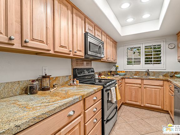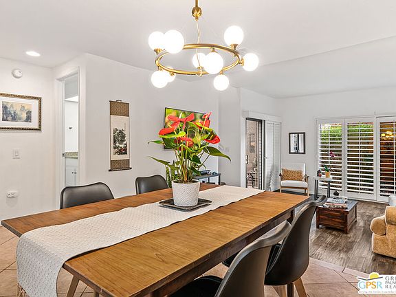 Offered turnkey furnished, this 3BR/3BA condo in the heart of Rancho Mirage, provides the perfect blend of spaciousness, convenience, and style in an absolutely ideal location. Smartly nestled into a quiet locale within the parklike setting of Desert Village, you'll find a well-thought-out floor plan with the living areas, formal entry, one bedroom and one bath downstairs on the main floor. To create privacy and an ample sense of separation, the generously-sized primary suite is located upstairs, with sufficient floor space to create a sitting area, or to graciously accommodate other options for work or relaxation. The adjoining ensuite primary bath is also amply proportioned with large double vanity, and luxurious soaking tub. A second ensuite bedroom (and bath) upstairs offers the perfect opportunity for a comfortable guest suite or home office, with mountain views and a large south-facing window. The kitchen is updated with a stylish stone countertop, tasteful warm-tone natural wood cabinets providing oodles of storage, and a stackable washer and dryer tucked away in a closet. By providing a few steps down into the living room from the kitchen and dining area, the architect created a dynamic flow of open spaces, creating higher ceilings in the living room for a greater sense of spaciousness. Adding to that sense of spaciousness, a large glass slider leads to a private south-facing patio, in essence an adjacent outdoor room, with plenty of winter sunshine. The patio is secured by an attractive solid gate for easy access to nearby assigned parking. In addition, the pool is just steps away, and easily accessible either from the patio or the front door. Plantation shutters are used throughout for comfort, privacy, sun control and, more importantly, a sophisticated sense of style. The community features lush landscaping, a thoughtful array of plantings and a small grassy oasis at the west edge of the community which serves as perfect picnic spot or dog walking area. Desert Village is just minutes from shopping, dining, and everyday services, including Whole Foods, Trader Joes, Target, REI, Barnes and Noble, Bristol Farms, Planet Fitness, The Palm Desert Aquatic Center, and many dining options, both casual and fine. The Eisenhower Hospital Campus is also just a short distance away, as are designated bike routes and popular hiking trails. Come discover 71824 Eleanora Ln in Desert Village, a small "villa" enclave in the heart of Rancho Mirage surrounded by desert beauty and urban amenities.