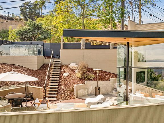 Dramatic Lautner-inspired architecture in the prestigious Outpost Estates. Proudly presenting the George Deutsch Residence. Deutsch worked with Lautner on the world-famous Wolff Residence (1963), quickly becoming enamored with the unique design of Lautner's masterpiece. 7187 Macapa is Deutsch's site-specific, 2/3 scale model of Wolff, Lautner's only homage to his teacher, Frank Lloyd Wright. George Deutsch built his dream home for himself. 7187 Macapa is sited on a rare double wide serenet street in the Hollywood Hills, which culminates in a cul-de-sac. The home is the product of a comprehensive multi-year restoration / modernization. Everything has been considered & meticulously renovated with custom finishes and thoughtful design. The living area boasts polished concrete floors, 16.5 foot ceilings, and walls of glass allowing for seamless indoor/outdoor living. The kitchen has been fitted with Miele appliances and custom blackened and stainless steel cabinetry. Upstairs, the private primary suite, features a considerable walk-in closet, custom wet room concept with teak flooring, rainfall showerhead, ceiling mounted tub filler, and freestanding Badeloft tub. With impeccable design and thoughtfully designed spaces, this property is the perfect retreat from city life for the most discerning collector. Newer Ipe multi-level decks offer abundant space for entertaining and taking in sunsets. Outdoor amenities include a lounge area, fire pit, a jacuzzi, and landscaped terraces. The garage has been converted into a fully equipped ADU. All this, only moments from Runyon Canyon hiking trails, West Hollywood, the Studios, and 101 Freeway.