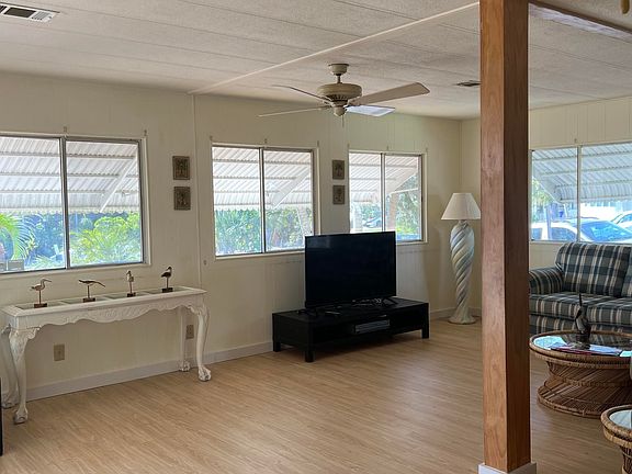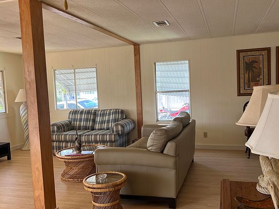 Sunny & Bright 2 Bedrm/2 Bath Doublewide in Ridgeway, all ages community. New laminate flooring thruout. New Frig 2023, microwave 20, dishwasher 21, disposal 20, washer/dryer & 30 gal. Hot Water heater 2019. New A/C July 2018 & serviced every 6 mos. Metal Roof. FURNISHED. Large Living Room w windows galore & additional breakfront/bar. The charming Kitchen is large w newer wood cabinets, deep divided sink, new flooring & a slider out to the lanai. The Master Bedrm is large w ensuite bath & walk in closet. The master bath has a new tub & Chair height toilet. The guest room is a good size w built-ins & full bath on the hall. The guest bathroom has a step in shower, newer vanity & chair height toilet. The lanai has awning windows & separate A/C. Fully fenced back yard - 2 sheds. Pets OK.