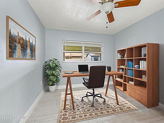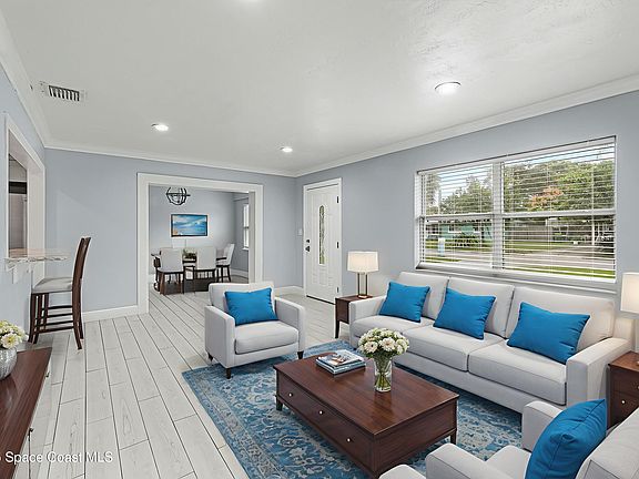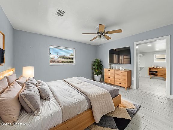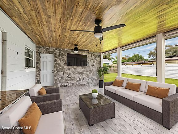 Beautifully updated 3 bedroom, 2 bath home featuring a new 2024 roof and stylish modern finishes throughout. The interior offers new tile flooring, designer lighting, custom barn doors, and a fully remodeled kitchen with high-end appliances, sleek countertops, and a contemporary backsplash. Both bathrooms have been upgraded with elegant quartz finishes and modern fixtures. The spacious primary suite includes a large walk-in closet with custom built-in shelving. Enjoy outdoor living at its finest with a covered patio and a full luxury outdoor kitchen, ideal for entertaining year-round. The large fenced yard provides privacy, along with a secure shed for additional storage or workshop needs. Plenty of room to park your boat or RV with ease. Conveniently located just minutes from beaches, Kennedy Space Center, shopping, and dining. This move-in-ready property blends comfort, style, and functionality—truly a must-see!