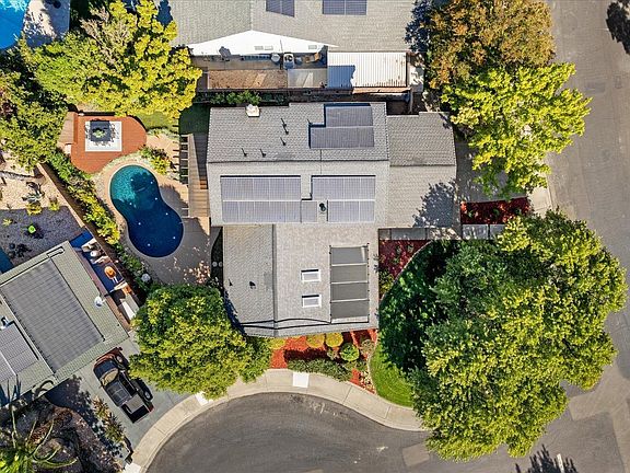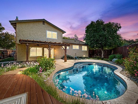 Welcome to this stunningly remodeled Vacaville home, situated on a large corner lot with owned solar, a newer HVAC system and a sparkling solar-heated pool. Step inside to soaring vaulted ceilings with wood beam, skylights and a formal dining area that set the tone for elegance. The Chef's kitchen is the heart of the home, showcasing granite counters, bar seating, white cabinetry with glass accents and pullouts, Wolf gas cooktop, double ovens, newer dishwasher and a built-in Bosch refrigerator. A convenient downstairs bedroom and full bath are ideal for guests, while the inviting family room offers a gas fireplace insert, surround sound and a dry bar with a wine refrigerator, perfect for entertaining. Luxurious primary suite greets you with double doors, built-in closets and a dual-sink vanity. Remodeled bathrooms include a jetted tub, while engineered hardwood flooring, new carpeting, crown molding, upgraded doors, window casings and dual-pane windows elevate the home's style. Outside, fresh landscaping with lighting enhances curb appeal and the backyard is a true retreat with a pergola featuring a ceiling fan, deck and turf for year-round enjoyment. This exceptional home blends thoughtful upgrades with resort-style amenities, offering the perfect setting to relax and entertain.