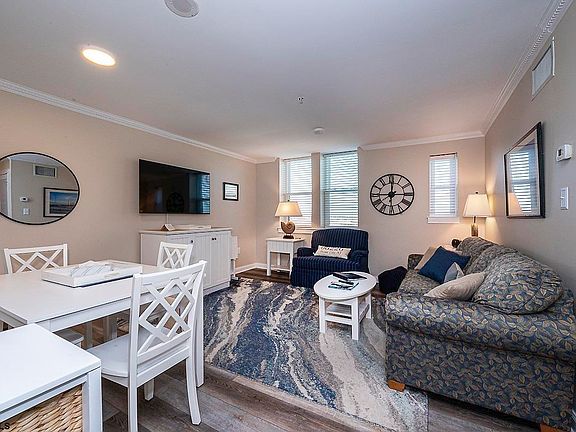 Area rugsStainless steel refrigeratorCrown moldingDining furnitureNew mattressesBeautiful boardwalk fronted buildingGranite counters
