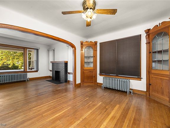 Inside, you’ll be wowed by the stunning natural woodwork and pristine hardwood floors throughout the first floor. The elegant living room boasts a rounded ceiling and a decorative brick fireplace with mantle, while the formal dining room showcases built-in corner hutches. The spacious kitchen offers vintage charm with custom-built cabinets, a white refrigerator, gas stove, and retro diner-style flooring.