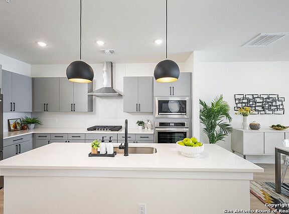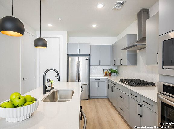 Introducing Grayson House, blocks from San Antonio's Historic Pearl District and close proximity to Downtown San Antonio and St. Mary's Strip. This three bedroom townhome showcases a sleek, thoughtful design, open layout, and modern finishes. Experience elegant features, including quartz countertops in the kitchen and bathrooms, a smart thermostat for optimal climate control, keypad entries for added security and convenience, and matte black hardware for a chic, modern aesthetic. Tile flooring throughout all bathrooms, attached one-car garages, and expansive walk-in closets with custom-built wood shelving add to the appeal. Enjoy the convenience of kitchen islands perfect for cooking and entertaining, a full-size front load laundry set, high ceilings that enhance the sense of space, a french door fridge, a 52-bottle wine fridge, a gas cooktop, a canopy vent hood, and a wall oven for gourmet cooking. Wood-style flooring throughout the living room, kitchen, and bedrooms completes the elegant design. Experience the vibrant Pearl-area growth with new residential, commercial, and retail developments within walking distance. Grayson House offers a unique blend of convenience, and modern urban living. Make Grayson House your new home and be part of a dynamic, evolving, urban community.