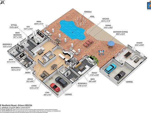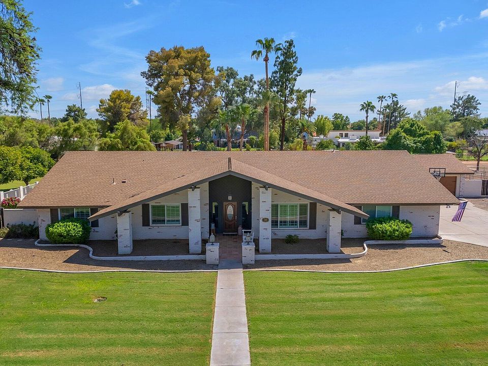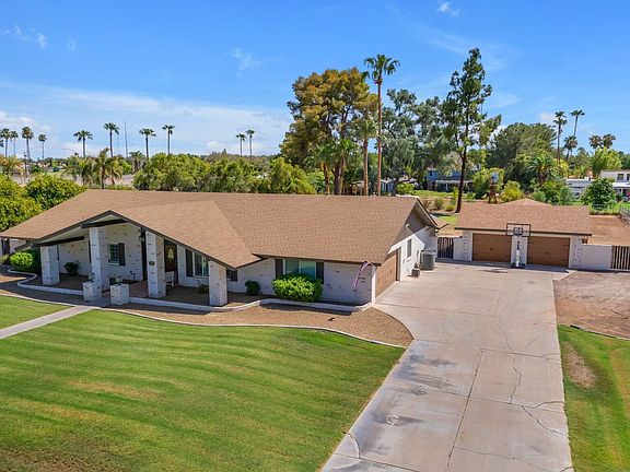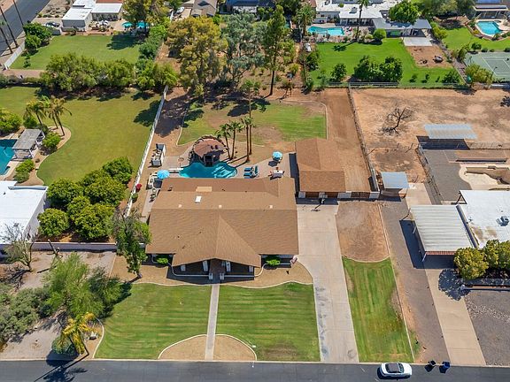 Nestled in the heart of Gilbert, Arizona, this beautifully remodeled residence epitomizes luxury and warmth. As you step into this expansive home, you are immediately greeted by its open and airy ambiance, enhanced by vaulted ceilings adorned with rustic wood beams. The 4 generously sized bedrooms are complemented by an additional den or flex space, and an enchanting bonus room that opens gracefully via French doors, leading you to an oasis-like pool area. The outdoor space promises endless days of fun and relaxation. Dive into the glistening pool, complete with a ramada, spa, grotto, and slide, or unwind at the built-in BBQ area. The expansive covered patio is perfect for both large gatherings and intimate evenings. Adding to its charm is a north/south exposure, ensuring optimum sunlight throughout the day. The heart of the home, the kitchen, boasts modern stainless steel appliances and a spacious island, making it a chef's dream. This seamlessly flows into the family room and great room, creating an ideal space for entertaining and family moments.