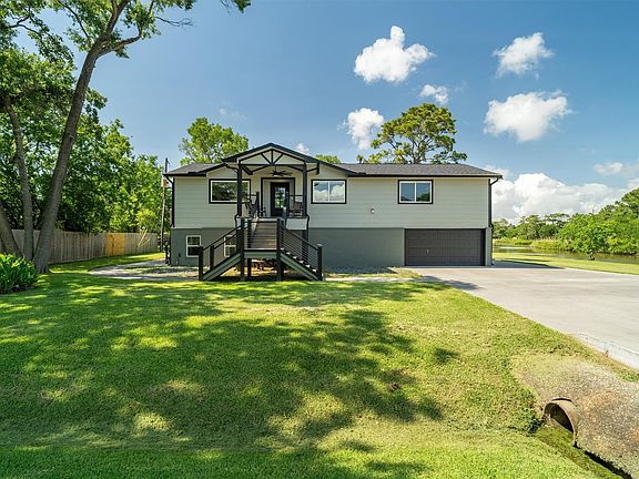 It is no surprise that this one of a kind 4/2/2 home is affectionately called "the Treehouse." Upon entering, you are immediately immersed into a treehouse-like atmosphere, with expansive picture windows offering stunning views of both land & sea*Situated on a 0.6-acre lot & bordered by Taylor Bayou, this property is the perfect setting for fishing or kayaking*Front & back patios equipped w/mosquito spray system & cable railings for unobstructed views*Living room seamlessly overlooks the open kitchen with glass-tiled wall, cased windows throughout, soft-close cabinetry & quartz countertops*Barn door opens to a Texas-sized walk-in pantry*Dining room features a barrel ceiling w/tongue-&-groove detailing & personalized lighting*Primary suite offers views of the bayou, custom adjustable closet & pocket door leading to double vanities with a glass-less tiled walk-in shower*Front hall leads to 3 more bedrooms w/walk in closets & modern farmhouse bathroom*Generator*No HOA, easy access to 146!