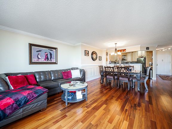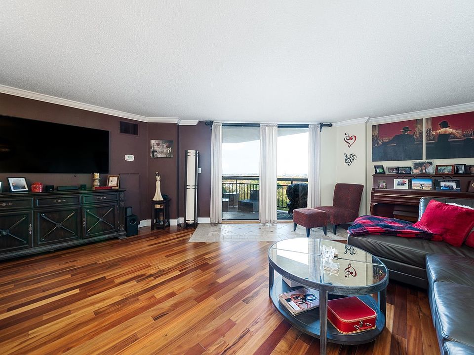The primary bedroom suite offers two closets and a luxurious oversized bathroom with a glass-enclosed standing shower. Additional noteworthy features include Tigerwood hardwood floors, crown and chair molding, central A/C, and one deeded indoor parking space.