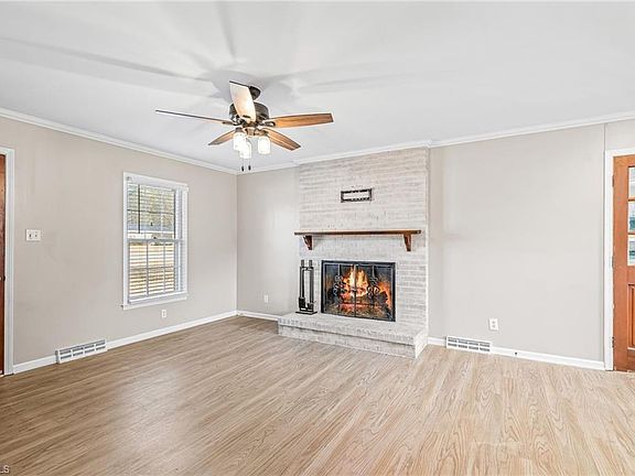 All Brick home with Metal Roof on 1 acre in Eastern Alamance High District, 3 bedrooms, 2 updated Bathrooms in 2021. Renovated Kitchen 2021 with New Cabinets, Subway tile backsplash, Stainless Appliances (dishwasher, stove, microwave, refrigerator remains), updated fixtures. Luxury Vinyl Flooring through out home. Wood burning Fireplace in Living Room; 2022 Added Screen Porch off of Double Carport and concrete patio; Old garage is not heated or finished great storage/play area 15x20, Heated Laundry room is off this room w/electric wall heater; New double doors from Carport. Two Storage buildings remain 12x24, 12x12; Paved Driveway with nice flat lot.