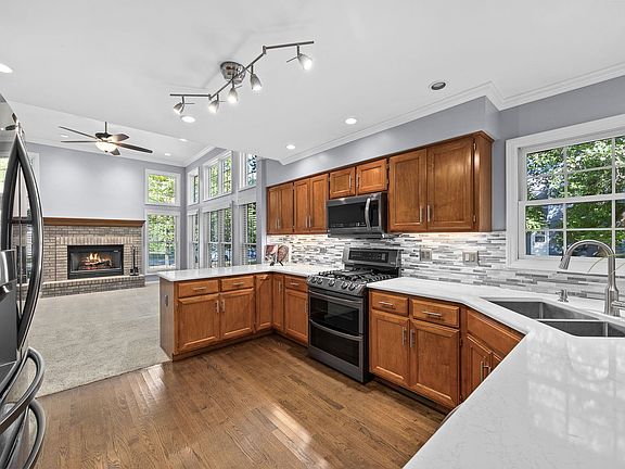 FALL IN LOVE with this beautiful two-story home, where timeless charm meets modern comfort and elegance. A cozy front porch welcomes you in, while the professionally landscaped corner lot and mature trees creates stunning curb appeal. Step inside the inviting two-story foyer with gleaming hardwood floors, where natural light fills the space. Just off the entry, a dedicated home office with a custom wood desk provides the perfect setting for a remote work or study. The main floor also features a formal dining room and a living room with a charming bay window, filling the space with natural light. The chef's kitchen is designed to impress with quartz countertops, black stainless steel appliances, a modern ceramic tile backsplash, touchless faucet, and a cozy breakfast nook. Rich wood cabinetry and hardwood flooring complete the space, while sliding glass doors open to a huge wood deck-perfect for gatherings or quiet evenings. At the heart of the home, the family room shines with soaring 12-foot ceilings, a dramatic wall of windows, and a wood-burning fireplace. Upstairs, you'll find four spacious bedrooms, including a luxurious master suite with a walk-in closet plus a second closet and a spa-like bath featuring a double vanity, soaking tub, and separate shower. A second full bathroom serves the additional bedrooms, each with generous closet space. The finished basement expands the living area with a versatile recreation room, playroom, and exercise room, along with abundant storage. Additional highlights include a 2.5-car garage with built-in tool organizers, attic storage space, and a professionally landscaped corner lot with sprinkler system surrounded by mature trees. With its thoughtful design, inviting spaces, and warm character, this home is more than just a place to live-it's the perfect place to create lasting memories with family and friends. It is your DREAM HOME !