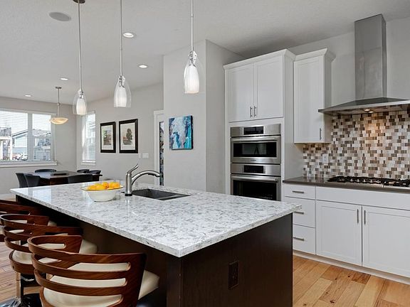 * Gourmet Kitchen & Great Room High-end quartz counters, oversized island, separate cooktop & built-in oven, stylish tile backsplash, and flowing layout into the dining and living areas complete with an electric fireplace and striking stone wall feature.