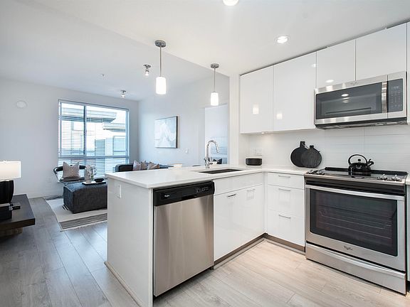 Don't miss this bright and spacious 2 bed + large den home in The Shore by Adera! This like-new unit features a comfortable and efficient layout that feels spacious with separated bedrooms, a large wheelchair accessible bathroom, and a bright white kitchen with quartz counters and SS appliances. Relax on the spacious deck overlooking the quiet Piazza with partial mountain view. The den has its own ventilation and doors - ideal as a nursery or office. Both bedrooms have exterior windows facing the Piazza. Top-notch amenities include a gym, yoga studio, playground, and bike storage. Pet & rental friendly strata. Includes 1 parking & 1 locker. Close to shops, transit, schools, Spirit Trail, Lonsdale Quay & Mosquito Creek. Easy to show.