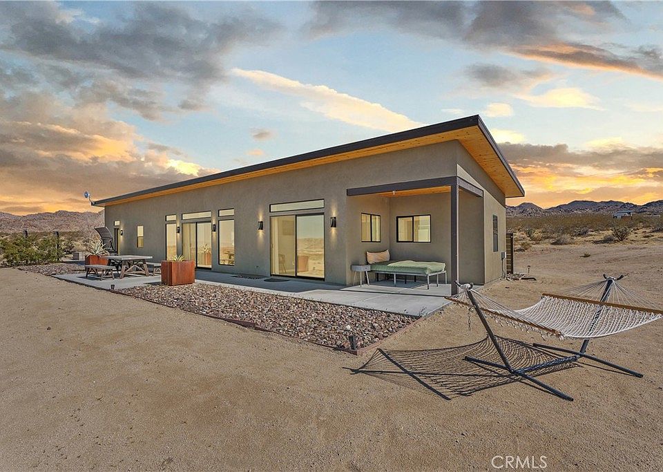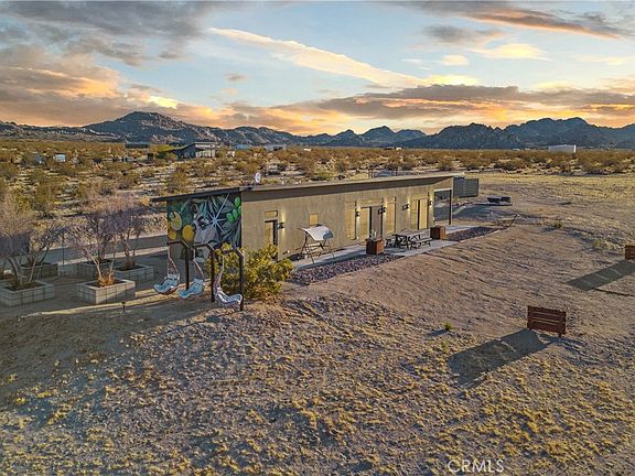 Modern 3 Bed 2 Bath Luxury eco-living in Joshua Tree, on 4.35 Acres of private land, built in 2019 with unobstructed views and direct access to hike the North Boundary of the Joshua Tree National Park. Develop your own eco conscious escape with unmatched privacy and panoramic vistas. The open concept interior is designed for seamless indoor-outdoor living. 3 bedrooms and 2 baths span 1360 sq ft of living space. Expansive windows flood the interior with natural light and miles of desert scenery while polished concrete floors, custom cedar cabinetry, stainless steel appliances, and quartz countertops add a touch of sleek, minimalist elegance. This modern single-level home is Solar powered with newly installed and fully paid for Tesla panels, a private water well, septic system, propane tank piped to the house, plus a back up water tank and generator, making this home 100% self-sustained, completely off grid and independent of all city utilities. The primary suite offers a walk in closet, patio access and en suite bath with soaking tub and separate glass enclosed shower. Two additional bedrooms, one with patio access, rest on the opposite side of the home sharing a nicely appointed bath with a walk in glass enclosed shower. Laundry and storage are hidden behind a stylish frosted glass paneled door in the hall. The 2 car covered Carport can double as another shaded entertainment area. Outdoor experiences such as swings, cast iron cold water soaking tubs, outdoor shower, day bed, a firepit, BBQ/ Dining area, and horseshoe pit enhance this chic remote experience. Truly an Oasis of pure peace and privacy. Whether you're stargazing in one of the top 4 dark sky locations on Earth, soaking in a sunset from the outdoor tubs, or swinging your cares away with a book in hand, this home offers a rare blend of tranquility, style, and sustainability. Don't settle for ordinary when you could create some magic in this ideal, private retreat that cohabitates with nature in the most eco-friendly, off grid, luxurious experience in the desert. Downtown Joshua Tree is a 5-minute drive to enjoy the culture, chic eateries and unique shops. Infamous Pappy & Harriet's is only 25 minutes away. 45 min to Palm Springs. Whether you are seeking a remote personal residence, an easy escape from city life or an eco-friendly income producing vacation rental/AirBNB this rare find will have you captivated. Plus 4.35 acres for additional units or outdoor expansion to fulfill your every dream!