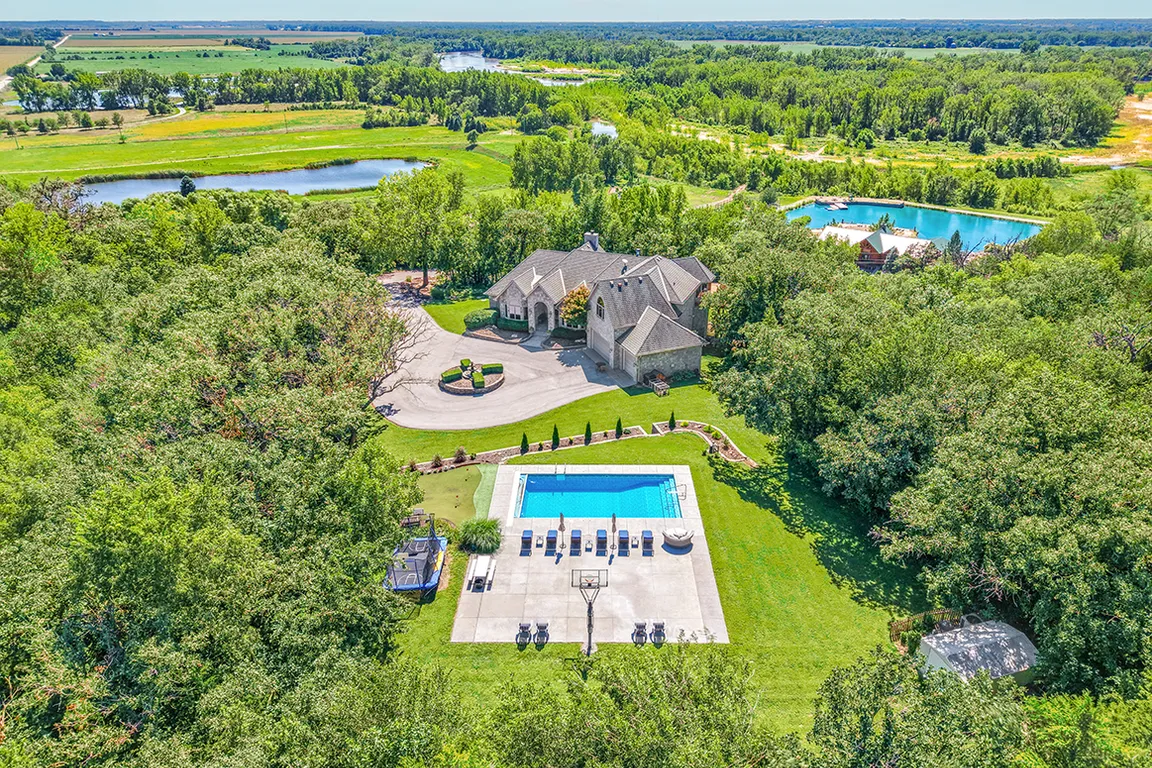 Spectacular 1.5 Story Walkout on 7.37 Wooded Acres with Panoramic Views of the Elkhorn River & Wildlife Sanctuary! Majestic design w/all-stone exterior, circle drive, new landscaping (2024), 6 car heated garage, heated sports pool (new cover-2023), sports court, waterfall, 24x24 putting green & fenced backyard (2024). Renovated interior w/new hardwood floors ...