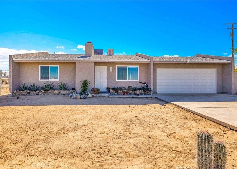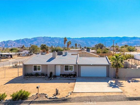 This Lovely Home is a Must-See! Being sold turn-key furnished, this is an amazing opportunity for all! Discover the perfect blend of comfort, style, and functionality in this beautifully updated home situated on a spacious corner lot. Set across from wide-open desert landscape, this property offers sweeping, unobstructed panoramic views to the North, enjoyed from both the exterior and the expansive picture window that brings the scenery right into your living room. Inside, fresh interior paint creates a bright, modern feel throughout. Newer laminate flooring compliments the cool tones. The cozy fireplace makes this the perfect place to unwind after a long day, or to host memorable gatherings with family and friends. This home is packed with upgrades, including a newer roof, newer HVAC system plus energy-saving evaporative cooling, new dual-pane windows, and a new garage door opener for added convenience. Fresh, plush carpeting enhances the bedrooms, while the bathroom showcases a brand-new tub and shower enclosure along with an updated vanity featuring double sinks. For additional comfort and versatility, a mini-split air-conditioning system has been installed in the garage, creating a pleasant environment for doing laundry, tackling projects, or completing everyday tasks. An attractive, large sliding glass door off of the kitchen leads to an inviting courtyard complete with a cozy firepit, perfect for evenings under the desert sky, outdoor dining, or relaxed gatherings with friends. Ideal for those who value outdoor space and versatility, the property features separate fenced areas perfect for pets, gardening, or gatherings with family and friends. With abundant parking, ample enough to accommodate an RV, you’ll have room for all your vehicles, toys, and guests. Move-in ready and thoughtfully improved, this home offers exceptional value, comfort, and unmatched desert vistas, all in one delightful desert package. Conveniently located just minutes from the 29 Palms Marine Corps Base. Don’t miss your chance to make it yours! Call an agent today!