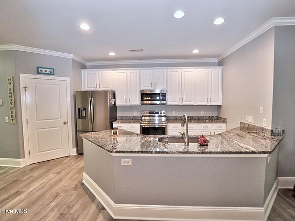 Welcome to this charming 2-bedroom, 2-bath single-story townhome, ideally situated between Ocean Isle Beach and Sunset Beach. With an inviting front porch perfect for morning coffee and a thoughtfully designed open floor plan, this home combines comfort and convenience in a location close to grocery stores, pharmacies, restaurants, banks, and local shops. Inside, you'll find LVP throughout and tiled bathrooms, a cozy electric fireplace, and a spacious living area that flows seamlessly to the fenced and tiled patio with storage closet via glass sliders. The large kitchen features granite countertops, stainless steel appliances, and a walk-in pantry, offering both style and functionality. The guest bedroom features a vaulted ceiling, LVP flooring and a large window providing an abundance of light. The owner's suite boasts a vaulted ceiling, walk-in closet, double vanity, and walk-in shower for a spa-like retreat. Whether you're seeking a primary residence, vacation getaway, or investment opportunity, this townhome is a perfect fit—just minutes from the sand and surf!