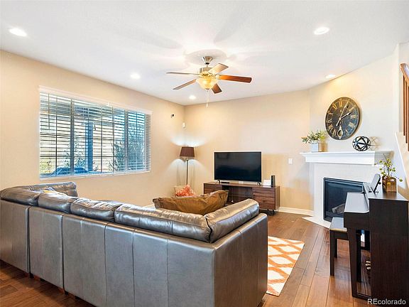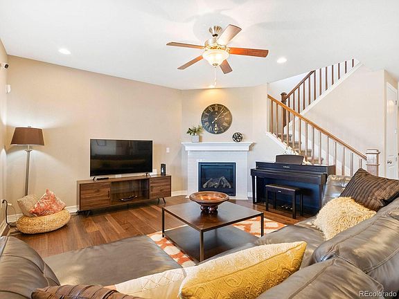 Ideally located in Serenity Ridge, this beautiful former model home with five bedrooms, four bathrooms, and a finished basement is the home you have been waiting for! The entry invites you into a bright and open floor plan with hardwood floors throughout. The main floor boasts an expanded gourmet kitchen with upgraded cabinets, double ovens, gas cooktop and oversized granite island with seating. The kitchen opens to informal dining in the sunroom with access to the backyard and beautiful covered patio. The large great room features a stylish modern fireplace A modern staircase leads to a spacious loft for secondary living, and the primary bedroom with five-piece ensuite features separate vanities and a walk-in closet. Three additional bedrooms, a full bathroom, as well as a large convenient laundry room complete the upstairs of this spacious home. Head downstairs to the full, finished basement which includes an expansive recreation area with game closet, exercise area, an additional bedroom with 3/4 bath, and storage spaces. The outdoor living space includes an expansive covered patio and a lovely fenced backyard with mature landscaping that opens to the greenbelt. Serenity Ridge is a premier master planned community with an exceptional lifestyle within an easy commute to Denver and DTC.