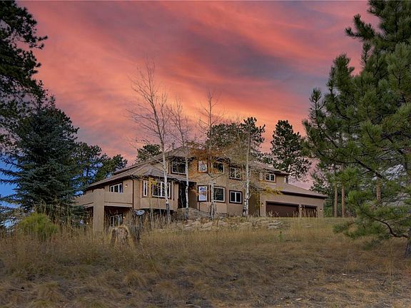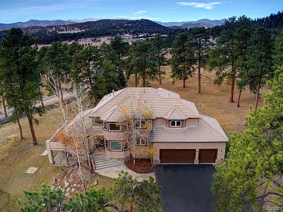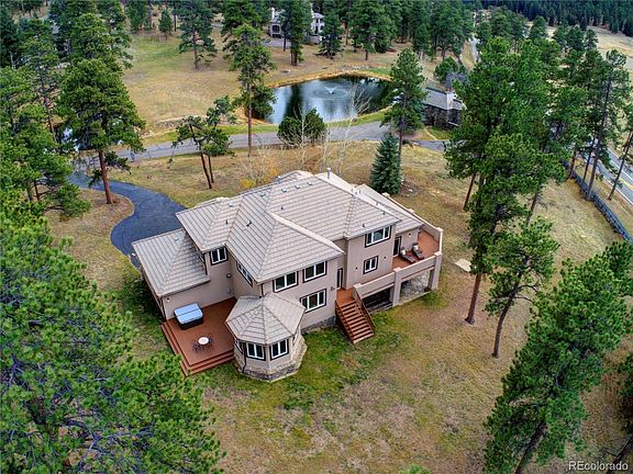 Big volume dream home nestled on 2.19 flat acres with nature, mountain views & buffalo out your front doors in The Timbers Estates, a stunning gated community & an enclave of 27 custom homes filled with gorgeous rock outcroppings, ponds & beautiful Colorado scenery we all love. Just beyond the regal stone entrance, this home is perfectly placed to give you breathtaking views of the community's water features, majestic mountains, offers unlimited privacy yet convenience to both Evergreen and Conifer amenities.