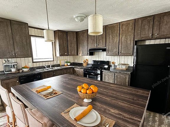 Kitchen Hub: Dark cabinets, sleek black appliances, and a large island perfect for cooking or casual dining.