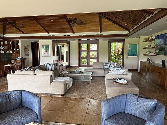Designed by architect Lucky Bennett, this spacious 4,821 square foot floor plan is excellent for hosting a number of guests The great room blends the sizable kitchen, living room, dining room, BBQ area and lanai into one living space so that you may easily entertain.