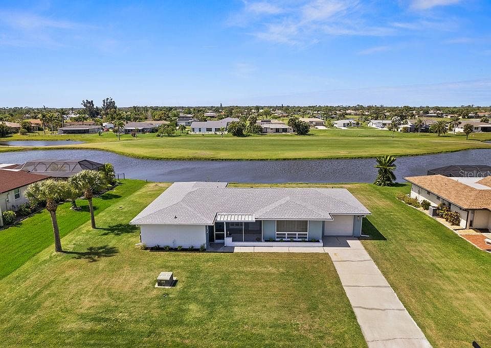 One or more photo(s) has been virtually staged. Welcome to your dream home in the heart of Rotonda West, Florida! This meticulously renovated 3 bedroom, 2 bathroom oasis boasts luxury finishes throughout, offering a lifestyle of comfort and sophistication. Bonus - this lot is extra large, 120 X 120 feet or 1/3 an acre. ***New roof in 2024***Irrigation system to keep lawn green and luscious. As you step inside, you're greeted by an open-concept design that seamlessly blends the kitchen, living, and dining areas. The gourmet kitchen is a chef's delight, featuring sleek countertops, premium stainless steel appliances, and ample storage space. Whether you're entertaining guests or enjoying a quiet evening at home, this space is sure to inspire culinary creativity. The living area is bathed in natural light, creating a warm and inviting atmosphere perfect for relaxation or hosting gatherings. Retreat to the spacious master suite, where luxury awaits. This tranquil haven features a beautifully appointed ensuite bathroom complete with a luxurious soaking tub, shower, and vanity sink. Two additional bedrooms offer versatility and comfort for family members or guests. Step outside to discover your own private paradise. The expansive backyard overlooks a serene lake and picturesque golf course, offering breathtaking views and endless opportunities for outdoor enjoyment. Whether you're sipping your morning coffee on the patio or hosting a barbecue with friends, this outdoor space is sure to impress. This home has been meticulously maintained and updated, with every detail carefully considered. From the new roof installed in 2024 to the designer finishes throughout, no expense has been spared in creating a residence that exudes both style and quality. Conveniently located in the desirable community of Rotonda West, this home offers easy access to shopping, dining, and recreational amenities. With its unparalleled combination of luxury, comfort, and location, this property represents the pinnacle of Florida living. Don't miss your chance to make this exquisite home yours. Schedule your private showing today and start living the lifestyle you deserve!