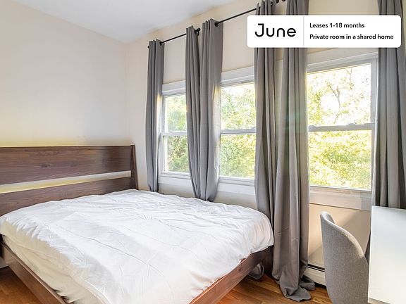 This Queen room in Mission Hill is available on a 12 month lease or a flexible short term (31 to 364 days) lease. You pick your custom start and end date. Monthly rent rate is determined by furnishing preference, move-in date and move-out date. Speak to a June representative for recommendations on the best stay duration for the lowest rate.