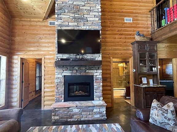 Steel Creek Lodge is a beautiful traditional style log sided cabin that boast natural sunlight throughout the home, with over 3000 sq. ft of living space, the home offers an open floor plan that has five spacious master bedroom suites, an open living with a floor-to-ceiling gas fireplace, open dining area, and a spacious kitchen that comes with stainless steel appliances, granite countertops, an oversize bar that gives plenty of room for large gatherings. The property is conveniently located on a paved rd. in the Oak Ridge Estate subdivision, proximity to the Choctaw Casino, Broken Bow Lake, Beaver’s Bend State Park, and all the attractions of Hochatown, OK. Steel Creek Lodge is a perfect investment for families looking to invest in their own vacation getaway or use as a STR. This 2-story home has four master suites on the first floor, and the fifth master suit is located upstairs adjacent to the open game room that offers both a pool and foosball table. There are two queen size sleeper sofas that serve as a lounging area or used as extra beds. You can step out onto the large upstairs balcony that overlooks the outdoor firepit and a covered grill area. The home has a beautiful wrap-around covered porch that offers a sitting area, fireplace, hot tub, and a dining table right off the kitchen. The driveway has a circle drive with plenty of space for extra vehicles or boat parking. Great curve appeal!