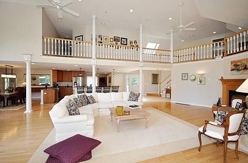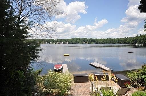 A home for all seasons.....Swim, boat, ski from your own waterfront on Fort Pond with beach, dock, patio, bocci court, & hot tub.....A fun piece of property to own and enjoy. Custom built contemporary with 4,193 square feet of open & dramatic living spaces at the end of a cul de sac. Propane fireplaced great room with large dining area and sliders to deck overlooking the pond. The maple kitchen is completely open to the great room letting the chef enjoy all the activity. A very gracious entertaining space. The master suite with 2 walk in closets and upscale new bath is just off the balcony which overlooks the great room. There are 3 additional large bedrooms with angles, lofts, interesting spaces on the other side of the balcony. The heated attached 2 car garage is very convenient. Plus a separate garage with unfinished 2nd story and shed....storage all over the place. Note there's a generator & central AC!