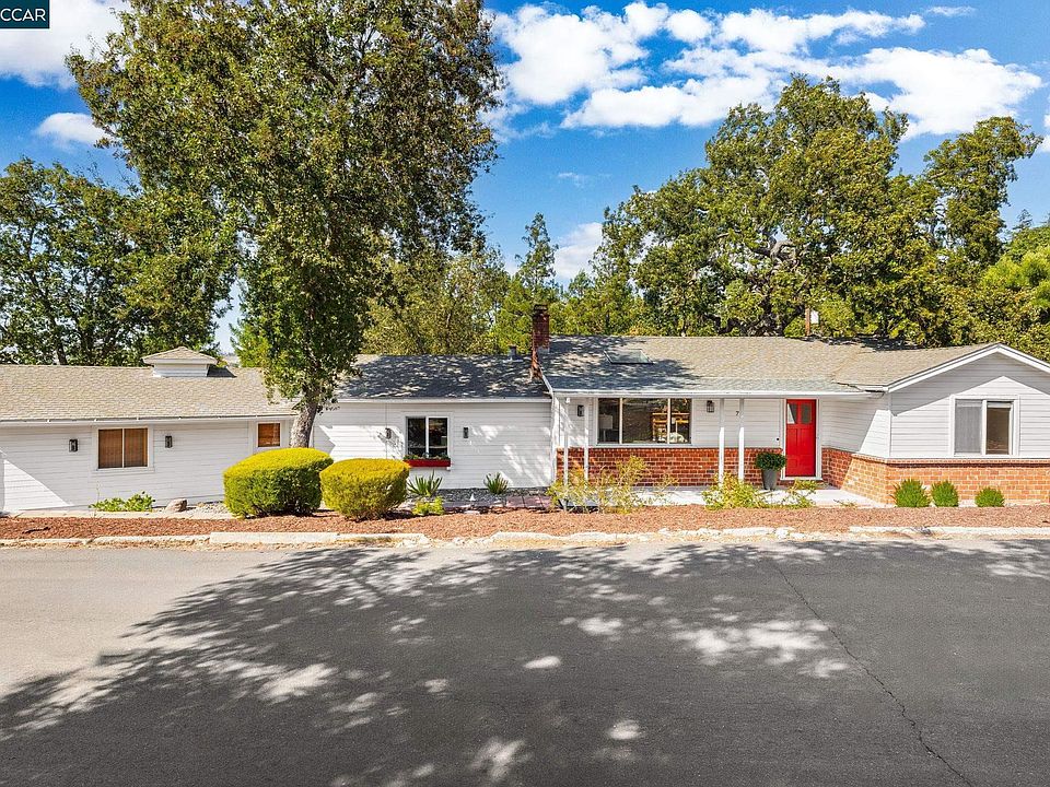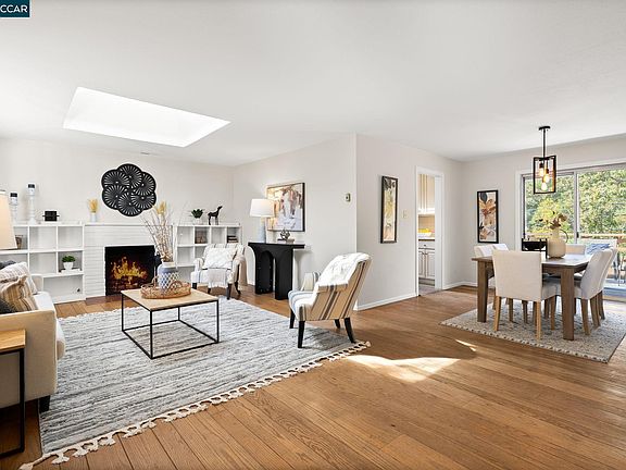 Tucked on a hilltop in Walnut Creek, just minutes from downtown, this single-story retreat combines natural privacy with city convenience. A covered porch welcomes you into an inviting interior where natural light pours through skylights and hardwood floors extend throughout. The living room centers on a fireplace with built-ins, creating a warm and functional focal point. The kitchen features a gas range and dining nook with direct access to the back deck, blending indoor comfort with outdoor flow. The primary suite offers dual closets and an ensuite bath, while two additional bedrooms share a full hall bath. A dedicated laundry room with exterior access adds everyday function. Outdoor living is highlighted by hillside views, raised garden beds, and a spacious deck shaded by mature trees. Excellent location close to BART and commuter routes, with access to highly rated Walnut Creek schools including Parkmead Elementary, Walnut Creek Intermediate, and Las Lomas High.