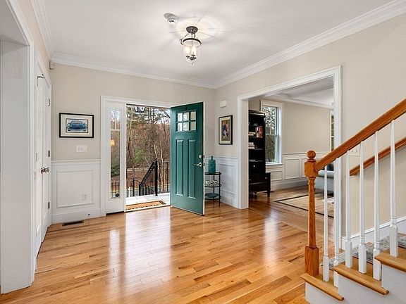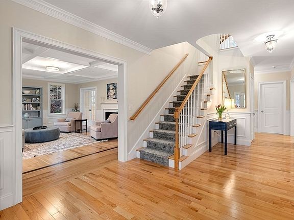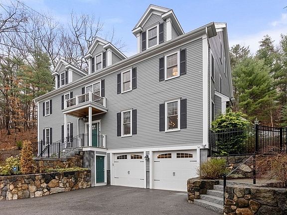 This grand colonial boasts four floors of living space, each exuding elegance and attention to detail. The first floor features a gourmet eat-in kitchen equipped with high-end appliances. Adjacent to the living room is a cozy family room, both sharing a pass-through gas fireplace. The formal dining room, complete with a butler station and fireplace, is ideal for hosting gatherings. On the second floor, the master suite offers a luxurious retreat, accompanied by two large en-suite bedrooms. This floor also includes a convenient laundry room and two separate office/study areas. The third floor is a versatile bonus room with a cathedral ceiling and balcony, providing an open space for entertaining, a playroom, or a gym. The lower level features an additional bedroom, full bath and an oversized four-car tandem garage. Set back on a large lot, this home offers a level backyard with a fire-pit patio, surrounded by woods for peace & privacy. Close to town, train, highways & schools.