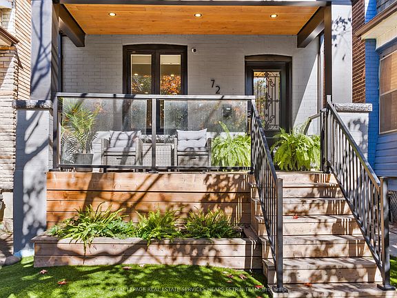 Situated on a charming tree-lined street in the heart of South Riverdale, this beautifully updated detached home offers the perfect balance of modern upgrades and warm, inviting design. With three bedrooms, three bathrooms, and thoughtfully designed indoor and outdoor spaces, 72 Harcourt Road is the ideal setting for modern family living. From the street, this home presents exceptional curb appeal, complete with a covered front porch and low-maintenance landscaping enhanced by high-quality artificial turf with built-in irrigation. The moment you step inside, you're welcomed by an open-concept main floor featuring rich hardwood floors, pot lights, and well-proportioned principal rooms. The living room overlooks the front garden and features a custom built-in feature wall, creating an elegant backdrop for everyday living and family gatherings. The adjoining dining area is spacious and seamlessly flows into the modern kitchen anchored by a large centre island, integrated high-end appliances, and an entire wall of pantry cabinetry for optimal storage.A standout feature is the functional rear mudroom with a stylish two-piece powder room and walk-out to the private backyard thoughtfully designed for everyday ease and functionality. Upstairs, hardwood floors continue through three well-appointed bedrooms. The spacious south-facing primary suite includes built-in closets with organizers and a stylish three-piece ensuite. Two additional bedrooms, each with built-in closets, share a beautifully updated four-piece bathroom. The finished lower level extends the living space with a generous recreation room, ample storage, and additional flexibility for a playroom, office, or home gym. Outdoors, the rear garden is a private and low-maintenance retreat, complete with an expansive tiered wood deck, an outdoor kitchen with prep sink and BBQ, and more premium artificial turf. Two parking spaces off the laneway add a rare level of convenience in the city.