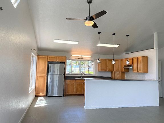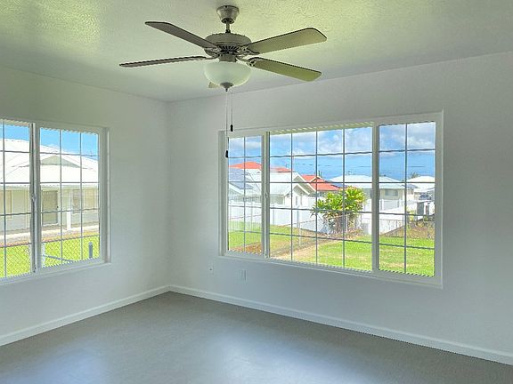 Newly renovated 3/2, large fenced back yard & 2 dog kennels in the quiet Waiakea Heights subdivision. Large open living area, walk-in closet in the master bedroom. Renovations include new water heater, GE SS range & refrig/freezer, garage door opener, waterproof vinyl flooring throughout, plumbing & electrical fixtures, mirror closet doors, recently repainted interior & exterior.