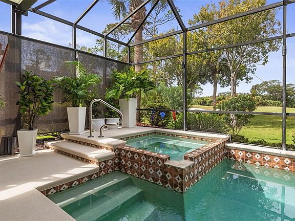 Screened saltwater poolDual-sided propane fireplaceSaltwater poolOversized windowsQuartz countertopsSerene golf course viewSoaring ceilings