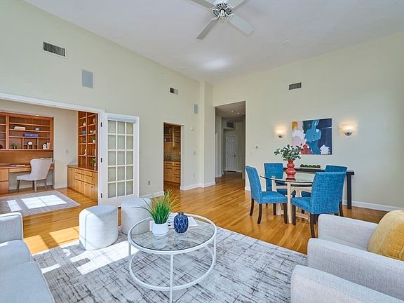 Location, location, Location. Rarely available, this dramatic first floor corner unit in the former Hyde School is located in the heart of Newton Highlands. The main level offers an open concept living/dining room with double height ceiling, large windows and hardwood floors. The updated kitchen has granite counters, Fisher & Paykel appliances and light wood cabinetry. The second bedroom, a full bath with laundry, an office/den with custom built-ins are on the main level. The primary suite is up 5 steps and offers a spacious bedroom with large closet and a modern bathroom. One-car covered parking. Great restaurants, shopping, Crystal Lake and the Green Line are minutes away. Easy access to major routes.