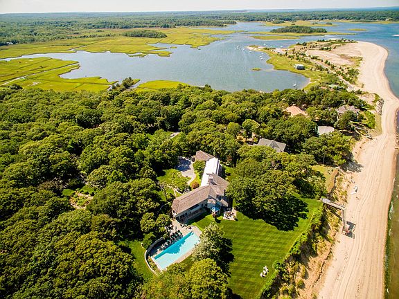 Once-in-a-lifetime opportunity to acquire a spectacular compound owning the largest land tract poised between Louse Point and Gardiners Bay. With over 250 +\- ft. of private sandy beach shoreline, the 4.35 acres include 4 separate and single lots surrounded by reserve for ultimate privacy. There is a 6000 sq. ft. main residence, large carriage house, separate 2 car garage, 1 acre water view building lot and additional lot on Accabonac Harbor with a private boat slip. The grounds are simply magnificent, cultivated as an exquisite arboretum traversed by connecting pathways, curved stone walls, raised flower beds and open green space. The 1986 Contemporary features superb craftsmanship beautifully updated through the years. Capturing spectacular bay views from nearly every room. Custom details include a sculptural floating stacked stone fireplace, interior windows, custom built-ins, window walls facing the bay and a rock garden on a covered stone veranda. A handsome great room, open kitchen, octagonal breakfast room, formal dining and stone terraces provide wonderful entertaining space. Flexible rooms offer space for offices, den/library, guest or staff quarters. A second floor gym easily translates to playroom, yoga retreat, billiard or media room with a second stairway to outdoor shower, terrace and spa. The carriage house features its own gated drive, 3 bedrooms, 3 baths, stone terrace and separate 2 car garage, private yet accessible by pathway to the main house. In addition, there is 1 acre buildable lot that would accommodate a future water view structure of choice and another lot on the harbor side that has a dock. In a class all its own, this rare offering is not to be missed. Contact Rebekah Baker of Sotheby's to set up a viewing.