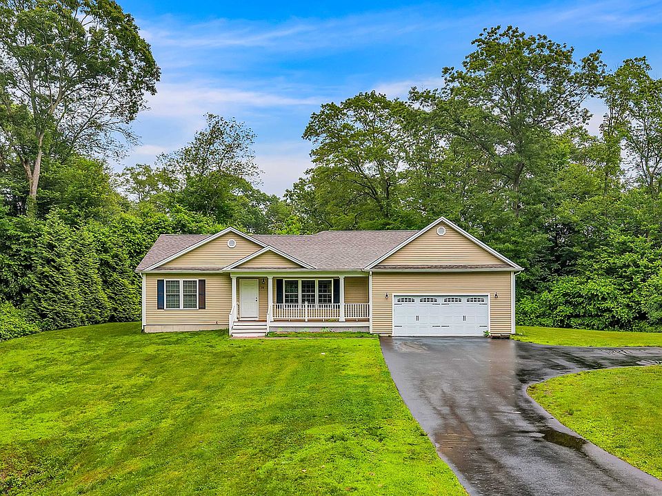 This quaint 3-bedroom, 2-bath Ranch offers 1,504 sf of easy living on a private 1.2-acre rear lot. A covered front porch welcomes you in, leading to a spacious living room filled with natural light from sizeable windows. The open kitchen features stainless steel appliances, a center island, and a large basin sink, flowing into a dining area with slider access to the backyard deck, convenient for indoor-outdoor living. The primary suite includes a full bath with a double-sink vanity and walk-in closet. Notable features include central air, an attached 2-car garage, and a generous level yard, ideal for gardening or gatherings. This property offers space, privacy, and convenience on a thoughtfully balanced setting at the end of a cul-de-sac.