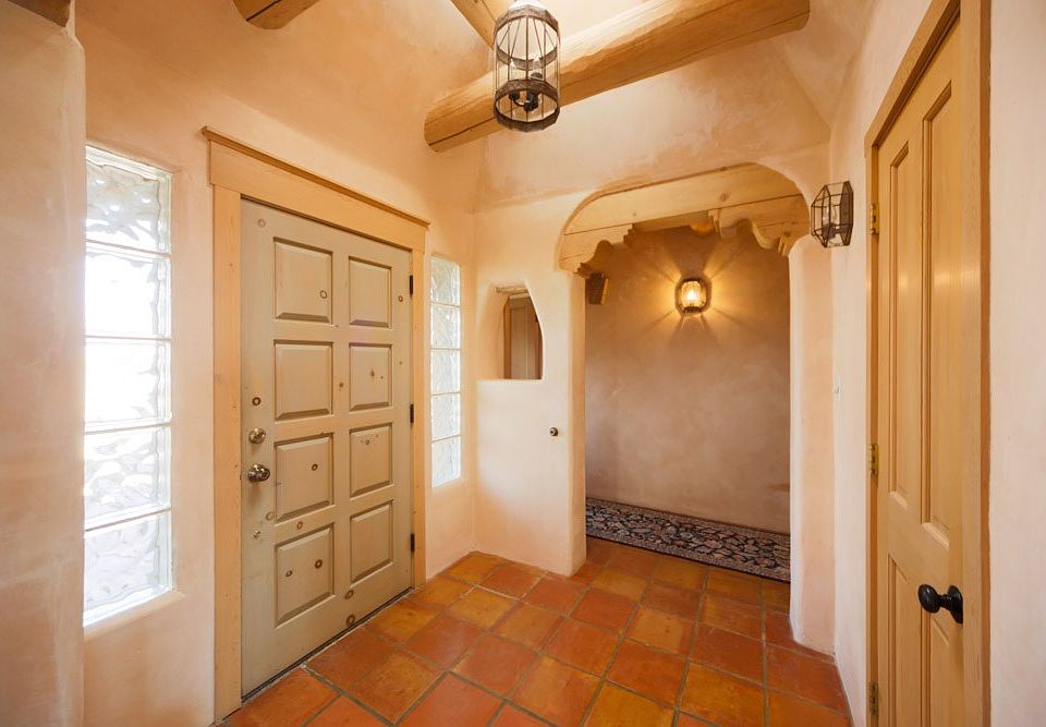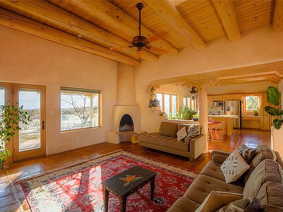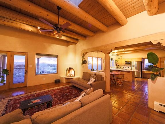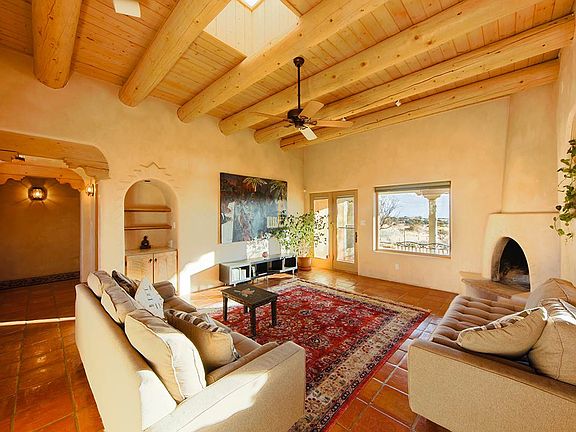 This beautiful Pueblo style home was custom built by the world-renowned architect Rick Driscoll, and it is one of only seven Driscoll homes in Eldorado. The home was perfectly situated on the 1+ acre lot to showcase the breathtaking view of the sunset over the Sandia mountain range, with big Southwest facing windows in the living room, dining room, and kitchen. It is brightly lit during the day, with its seven total skylights, open space and large, well-placed windows throughout. Equipped with beautiful entryway arches and a niche as custom design accents,this home features high ceilings with vigas supported by tongue and groove planking, Saltillo tile throughout, warm beige Diamond finish plaster walls and Kiva fireplaces in the living room, Master bedroom and office studio. The present owners installed new stainless steel appliances for the kitchen. The baseboard heating system, stove, oven and water heater are run on natural gas, and the water heater is assisted by solar panels to save on energy costs. There is a large jetted tub in the master bath, and a separate studio with wood floors and its own entrance off of the master bedroom. This home also has two securely fenced, beautifully landscaped courtyards, front and back. The front courtyard features a mature apple tree surrounded by a beautiful flower garden, rose bushes, shrubs, grass and an Iris bed. The backyard features a cottage style terraced herb garden, grapevines that produce abundant fruit, mature fruit trees.