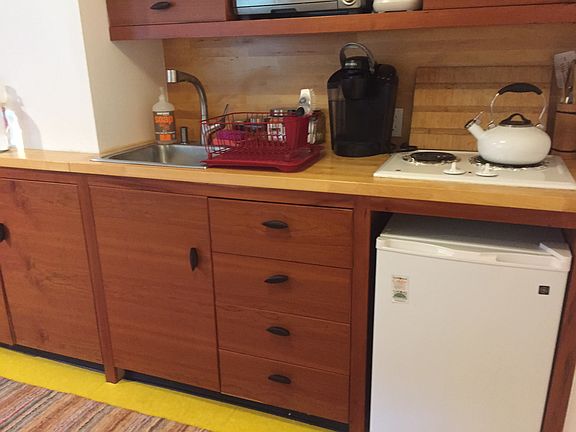 Ergonomic chairFurnished garden apartmentSeparate bedroomPrivate entranceDining areaHandcrafted woodwork kitchen station