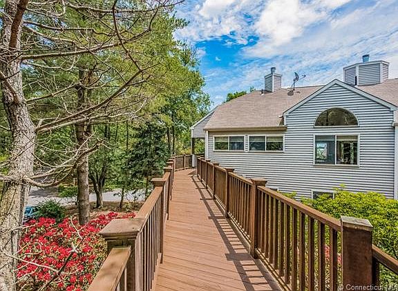 Views Views Views Dramatic upper level Contemporary with sweeping southerly river and salt meadow views from all major rooms. Stunning 1764 sq ft, 2BR end-unit with privacy and exquisite updates throughout. Spacious sunfilled rooms, lots of glass, hardwood floors, beautiful wood detail, tall ceilings, fabulous open plan. Two story LR and DR with gas fpl, crown moldings and glass doors to deck. New designer eat in kitchen with granite and stainless appliances open to great room. MBR suite on main level with elegant new bath, second upper level BR with full bath, lovely office den. Garage under. Upscale 80 unit community on 35 acres the Branford River with pool, tennis, clubhouse, marina, kayak launch. Walk to town and train. 15 min to Yale.