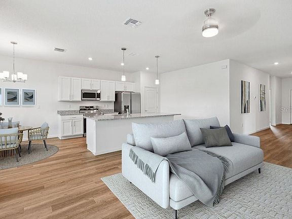 MOVE-IN READY HOME! This brand-new construction home offers the perfect blend of elegance, comfort, and modern convenience. Designed with durable block and stucco construction, this open floor plan features 4 bedrooms, 2 baths, and 1,801 sq. ft. of thoughtfully designed living space. Soaring 9'4" ceilings throughout the home create an airy, spacious feel. Enjoy the Florida outdoors with a 6’ x12’ covered porch. The stylish 36” white Shaker-style cabinets are beautifully complemented by Granite Valle Nevado countertops, adding a touch of sophistication to the kitchen. Luxury vinyl plank flooring flows seamlessly throughout the entire home, offering both durability and style. A stainless-steel appliance package is INCLUDED, featuring a 24.3 cubic foot side-by-side refrigerator with a built-in ice maker, a 30” freestanding smooth-top electric range, a 1.6 cubic foot over-the-range microwave, and a dishwasher - everything you need for a fully equipped kitchen! For added peace of mind, your purchase includes a 2-10 Builder’s Warranty. NOTE: Photos are for example purposes only.