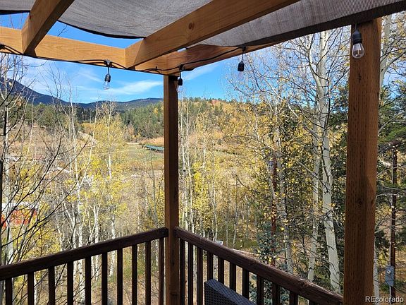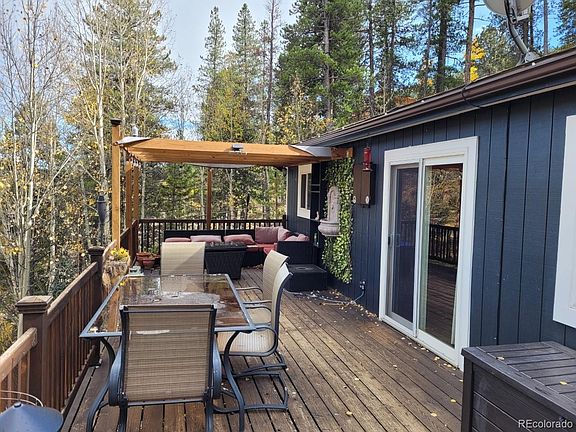 Whether you are looking for comfortable mountain living or that weekend getaway, this secluded and private feeling mountain cabin may just be what you are looking for.  The community does allow short term rentals if that appeals to you as an option for this home as well.  Sited in Harris Park in Bailey on nearly a half-acre you will find this home perched up from the road and nestled in the aspen and pine trees.  The property is fenced and at the road, is accessed by a key-coded gate.  There is plenty of parking at the top of the driveway for 3 - 4 vehicles.  You enter the home and are welcomed by a tiled entry with a rock/stone wall surround and wood burning stove.  The open floor plan beyond welcomes you with plush carpet beneath your feet in the living area and what could be a small dining area.  The kitchen adjoins this space with granite counters, an island, ideal for food prep, stainless steel appliances and a basket weave tile backsplash.  Just beyond the open floor plan to the exterior is a spacious wraparound deck, perfect for those cool summer mountain evenings and with views of peace and seclusion.  Back inside you enjoy a primary bedroom at the back of the home as well as a secondary bedroom or possibly an office.  In between the 2 bedrooms is a large laundry room with washer and dryer included as well as storage space and a full bathroom with elevated tub/shower.  The owners recently added a shed providing additional storage and with upgraded electric the shed has its own power, heat and a/c, making it available to turn the space into small living quarters if needed.  There is NEW CARPET throughout the home and NEW INTERIOR PAINT.  A NEW WELL PUMP and exterior paint within the last 2 years leaves you free to enjoy one of the community fishing ponds or just taking it all in after a long day on your deck.