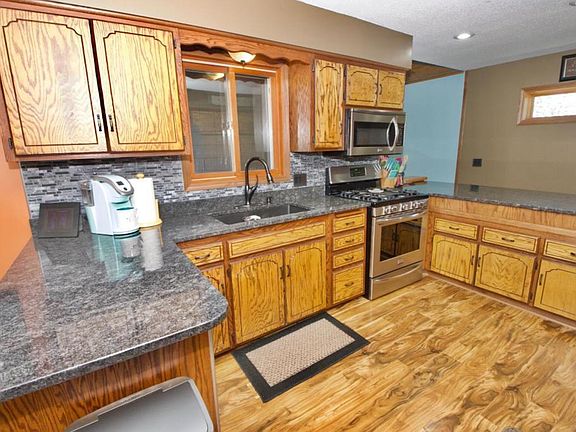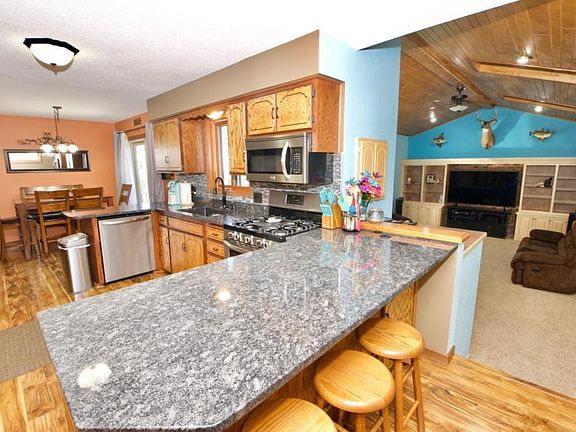 Updated home on nearly one acre! The home offers plenty of room to roam inside and out. Large kitchen with stainless appliances, breakfast bar, and tons of built-in storage space. Quaint dining area with access to the deck and views of the expansive backyard. Main floor master bedroom, main floor laundry, family room with vaulted ceilings, and living room with gas fireplace. Lower level with BA, 2 bedrooms and office. Outside features included large garden area, 14x14 gazebo, 2 car attached garage, and an additional 2 stall detached garage with 24x25 heated workshop.