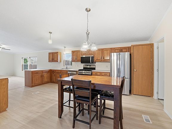This absolutely turn-key, newly remodeled home is a true gem, offering a desirable open-concept layout beneath soaring vaulted ceilings. Every surface shines, featuring new flooring and carpet throughout, and three fully remodeled bathrooms with new counters, sinks, toilets, tile, and fixtures, including a luxurious primary suite with a walk-in closet and ensuite full bath. The kitchen boasts beautifully refinished original hard oak cabinets, all new stainless steel appliances, and a stylish tile backsplash. Enjoy peace of mind with a brand new furnace and AC unit, and incredible outdoor living on your new cedar deck overlooking a private, nearly 1-acre lot that includes two storage sheds. With three current bedrooms and the potential for a fourth in the lower level (with egress), this home perfectly blends modern comfort with ample space, indoors and out.