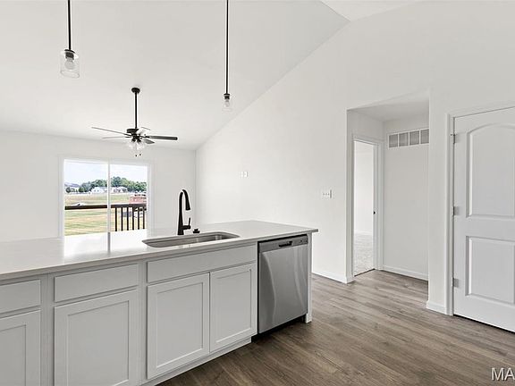 New McBride Homes Carolina ranch 2BR, 2BA will be ready this winter! Craftsman exterior! The main floor features wood laminate flooring, 6ft windows, and a vaulted ceiling. The open layout includes a large living room & a sliding glass door to the backyard. The kitchen has level 4 Winstead Burlap 42” cabinetry, flush countertop peninsula with breakfast bar seating, quartz countertops & stainless-steel GE appliances! Primary bedroom with a large window, walk-n closet, & private bathroom with 5ft shower & double bowl adult height vanity. Additional bedroom, full bathroom, main floor laundry add convenience. Two car garage! Upgraded matte black fixtures, ceiling fan prewires in bedrooms, 2 panel white doors & ¾ bath rough in at lower level. Nestled in Truesdale right outside Warrenton, Elkhorn Ridge is just minutes away from shopping, restaurants, grocery stores, & more. Enjoy peace of mind with McBride Homes’ 10 year builders warranty and incredible customer service! Similar photos shown.