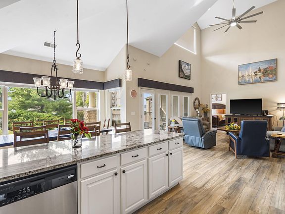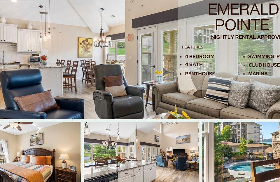 Rare opportunity to own a fully furnished high end retreat in Emerald Pointe, one of Table Rock Lake's most sought-after gated communities. This 4-bedroom, 4-bath residence showcases recent upgrades including luxury vinyl plank flooring, modern ceiling fans, new granite countertops, and upated paint throughout.Soaring floor-to-ceiling windows bathe the living spaces in natural light, while the covered deck overlooks the heated community pool--ideal for relaxing or entertaining. Designed with high-end furnishings and decor, this home is completely turn-key, whether you're looking for a private getaway or a successful nightly rental with proven income.Perfectly positioned next to the marina and just a short walk to the lake for fishing or swimming, you'll also enjoy quick access to Branson Landing's shopping, dining, and entertainment. Discover lakeside living at its finest in this exceptional Emerald Pointe property.