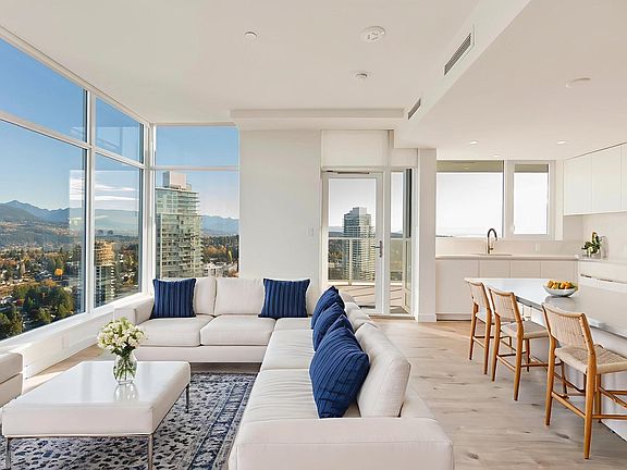 Experience elevated living in this stunning Sub-Penthouse at Smith & Farrow by Boffo. This corner 2 bed, 2 bath home offers 936 sq ft of refined space on the 44th floor, showcasing panoramic city, mountain, and water views. The open layout features a large kitchen island, generous dining area, and plenty of storage. Enjoy sophisticated interiors, premium finishes, and floor-to-ceiling windows that fill the home with natural light. Residents have access to world-class amenities including a fitness centre, outdoor pool, concierge, and elegant social lounges. Perfectly located steps from SkyTrain, shopping, and parks — this is luxury living at its finest in Burquitlam.