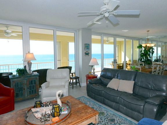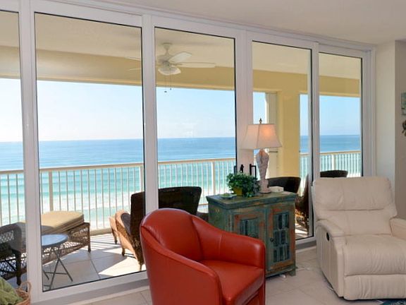 SIMPLY DIVINE! Spectacular panoramic views of the gulf & beach from one entire side of condo. A wall of windows with upgraded glass doors open to an expansive (approximately 60ft wide) balcony accessible from the living area as well as the master bedroom. Relax while watching the sunsets in the west from the well-furnished balcony! The open floor plan blends the living area, dining area, & kitchen together making it easy to enjoy a crowd or just a small group. The condo is well-furnished, has had a lot of TLC, & has not been rented. The kitchen features granite counter tops, stainless steel appliances, pretty cabinets, a pantry, & a breakfast bar. There are three bedrooms each with its own bath & walk-in closet. Other amenities include: hurricane shutters, plantation shutters, a