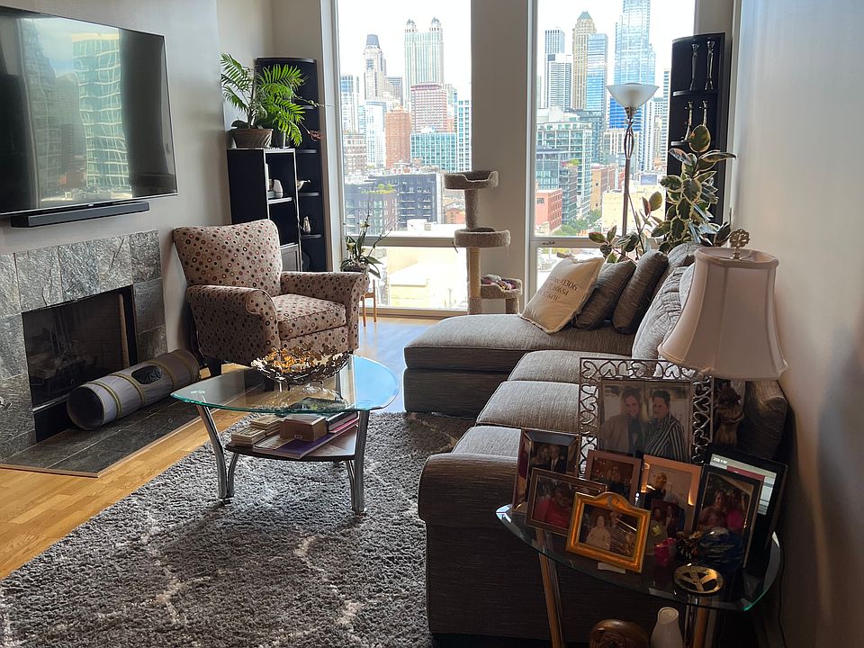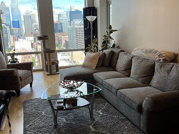 Beautiful two bed two full bath in Chicagos upscale neighborhood. Location close to both expressway and Lake Shore Drive. View is east, looks at Michigan Avenue. Floor to ceiling windows throughout. Black out shades in master bedroom. Apartment professionally upgraded. All new appliances and quartz counter tops in kitchen and master bath. Unit has both washer and dryer. AC/Heat controlled by occupant. Patio off of living room. 24 hour gym access with all new equipment. Door person 24/7. Walk to everything or hop the brown line three blocks away, Chicago ave bus 1/2 block over. Have the ambiance of a quiet area that is in the heart of the city.